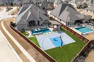 Experience luxury living in Lantana with this exceptional 5-bedroom, 5.2-bath home on an expansive lot. The backyard is an entertainer's dream, featuring a sparkling pool, basketball court, cabana, and built-in grilling station. Inside, stunning wood floors lead to an open-concept layout with modern and traditional touches. The chef's kitchen is a showstopper with an oversized island, gas stove, double ovens, and a dedicated wine and coffee center. The primary suite offers a spa-like bath with a soaking tub, large shower, and a custom-built closet. A second downstairs bedroom with an ensuite bath is perfect for guests. The dedicated office features built-in desks and cabinetry, while a theater or flex space downstairs adds versatility. Upstairs, a spacious game or flex area with built-in desks and cabinets provides additional functionality. With a massive 5-car garage and tons of storage throughout, this home seamlessly blends luxury, comfort, and practicality.