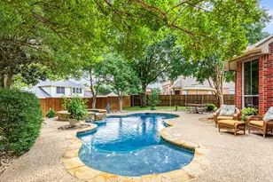 Gorgeous Updated Stonebridge Ranch Home with Pool and 3-Car Garage. The home features over $185,000 in upgrades. Situated on a pie-shaped lot, this beautifully updated home offers a backyard built for relaxation and entertaining with a gorgeous saltwater pool and spa featuring a waterfall, low-maintenance turfed yard, and a 12x10 storage shed tucked under majestic mature trees. The fully remodeled kitchen, taken down to the studs, showcases custom cabinetry with pull-outs and glass-front uppers, granite countertops with a large island accented by designer lighting, a Blanco apron-front sink, and premium KitchenAid appliances including a gas range, ultra quiet dishwasher, and microwave with convection option. The light-filled breakfast nook overlooks the pool, while the spacious living room with a gas log fireplace creates an inviting, open-concept space for gatherings. Upgraded wood-look tile runs throughout the main living areas. The primary suite boasts a cozy bay window and a stunningly remodeled ensuite with painted cabinetry, marble countertops, an expanded frameless marble-tiled shower with dual shower heads, a drop-in tub, and a walk-in closet. A powder bath and utility room with built-ins complete the downstairs. Upstairs you will find a large game room, three generously sized bedrooms-one with its own ensuite bath and two connected by a Jack & Jill bathroom. 3-car garage features built-in storage. As a resident of Stonebridge Ranch, you will enjoy exceptional amenities including a beach club, aquatic center, tennis and pickleball courts, clubhouse, parks, trails, and year-round community events. Roof and Gutters August 2025. AC on 1st Floor 2023. Both Furnaces 2019. Whole-House surge suppressor 2018.