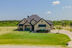 Stunning home in Brock ISD provides a charming combination of brick and stone exterior on 1.33 acres. Home offers 5 bedrooms, or 4 bedrooms plus an office, and 2.5 bathrooms, providing timeless style with thoughtful functionality. The heart of the home is the open-concept kitchen, designed for both gourmet cooking and everyday convenience. Stainless steel appliances, a pot filler, and a large center island make meal preparation a breeze, while the farmhouse sink adds rustic charm. Expansive counters and abundant cabinetry provide ample workspace and storage, and the island offers additional seating for casual gatherings. The kitchen seamlessly flows into the living area, where wood-beamed ceilings, abundant natural light, and built-in cabinets create a warm and inviting atmosphere anchored by a beautiful wood-burning fireplace. Step outside to a backyard designed for relaxation and entertainment. The sparkling pool with a tranquil water feature and a tanning ledge serves as the focal point, surrounded by generous patio space for lounging or dining al fresco. The fully fenced yard offers privacy and security, while the covered back porch-with its own wood-burning fireplace-sets the stage for cozy evenings under the stars. The sweeping views from the back of the home provide a serene backdrop year-round, making this outdoor space as functional as it is breathtaking. The primary suite is a retreat, boasting a spa-inspired bathroom with a walk-in shower featuring dual spray heads, a soaking tub, and extensive storage. The thoughtfully designed split-bedroom layout places the secondary bedrooms on the opposite side of the home, creating a private retreat for the primary suite. Large utility room with built-in cabinetry and counter space adds convenience, in addition to a drop-zone for backpacks and jackets. Come tour this beautiful home today and experience all it has to offer!