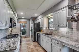 Private Pool Oasis! Welcome to your 3 bedroom dream home located on a quiet cul-de-sac. Fully updated, single story (NO HOA) with a beautifully renovated kitchen. Offering 3 bedrooms, 2 full baths and the perfect blend of comfort, style, and outdoor living space. Truly an entertaining home with 2 large living areas, wet bar and large built-in entertainment center which can also be used for storage. Formal dining room can also double as a home office. The kitchen with modern appliances featuring a 5-burner gas cooktop and wine cooler includes extra counter space, a large breakfast area and a built-in buffet with a beautiful quartz top. The primary bedroom ensuite has 2 generous walk-in closets with built-in dressers, dual sinks and a private deep soaking tub. Two additional bedrooms provide flexibility for guests, family, or a home office. Outside you will find a large spacious screened in patio and a retreat style backyard pool and landscaping. Perfect for year-round gatherings or quiet evenings under the stars. Additional features include a large laundry room which can easily accommodate an extra refrigerator and freezer; high efficiency HVAC (2023); updated 200-amp breaker box; roof and gutters (2016); extra parking pad; private garden workspace; garage with workbench, sink and insulated garage door. The Chisholm Trail biking, hiking trail is nearby. Centrally located and close to schools, shopping and parks