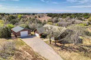 OPEN HOUSE 5-25-25 1-3pm. Contact LISTING AGENT for access to Gate 3. If you are looking to escape the hustle and bustle of city living, traffic, and stress, you will fall in love with this spacious Open Concept 3 BDR, 2.5 bath home on a serene 5 acre lot at The Hills above Possum Kingdom Lake. Ample amounts of privacy in this Retreat-like Oasis! The vaulted and beamed ceilings in the kitchen, living, and dining area make the area feel even larger than it already is. The extra large windows lining the back wall allowing plenty of natural light in and showcase the concreted expansive covered back patio with hot tub and fireplace to boot. You will absoluteliy love lookiing at the nearby pond, hills, valleys and trees while you enjoy the sights and sounds of nature all around. The stars are definitely brighter here deep in the heart of Nort Texas Palo Pinto Hil Country! The Big Bonus 30'x 40' spray foam insulated shop has a 16' roll up door and 12' eave height for your vehicles, boat, RV, or extras. You will also enjoy the upscale amenities that this gated lake community has to offer including the gorgeous infinity swimming pool located at the community clubhouse. Commercial grade fitness equipment inside for your use also. The tranquil community lake cabin has a boat dock and watercraft launch for fun days of fishing or hanging out on the lake. This is a great time to start planning for investing in your family's Possum Kingdom Lake Memories!