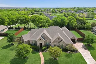 Tucked away in the heart of prestigious Prosper, this breathtaking one-story estate provides the perfect blend of sophisticated elegance and relaxed luxury living. Set on a .57 acre lot, this property is more than just a home, it's a private retreat, designed for those who crave both convenience and tranquility. From the moment you arrive, the home's impressive curb appeal captivates with manicured landscaping and a stately brick and stone facade. The open-concept design is an entertainer's dream, seamlessly flowing from the gourmet kitchen equipped with double ovens, pot filler, and an oversized island, into the expansive living area, where a corner stone fireplace and beamed ceiling set the scene for cozy nights. The primary suite is a sanctuary, tucked away for privacy with a spa-like bath featuring a soaking tub, an oversized shower, and a generous walk-in closet. Three additional bedrooms, each with spacious closets, ensure comfort for family and guests alike. The home office is offset from the main living areas, providing a quiet, distraction-free environment. Then there's the enormous game-media room, the ultimate entertainment retreat, ideal for fun and relaxation. But the true magic happens outdoors. Step outside to relax in your own private oasis where a Claffey-built play pool and spa, complete with a tanning ledge and water features, invite you to unwind under the Texas sun. The expansive covered patio with outdoor kitchen and counter seating, sets the stage for al fresco dining, weekend barbecues, and endless summer nights. And there's still plenty of yard for pets and play. Frontier Estates offers its residents a community pool + splash zone and lake. Located just minutes from top-rated Prosper ISD schools, town parks, and shopping & dining, this home offers the best of small-town charm with big-city convenience. If you're searching for luxury, space, and an unparalleled lifestyle, welcome home. Roof (2025)
