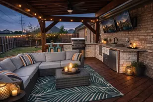 Rare opportunity to own a highly upgraded one-story home in Royse City with standout outdoor living built for entertaining. Backyard features a custom cedar pergola with fan and lighting, a fully equipped outdoor kitchen with Blaze gas grill, refrigerator, and storage, plus multiple seating areas. Expanded yard offers a blend of grass and low-maintenance turf with no immediate neighbor on one side, providing added privacy and sunset views. Open-concept layout filled with natural light includes a versatile flex space ideal for a home office or additional bedroom. Spacious primary suite with dual sinks and a well-appointed bath.