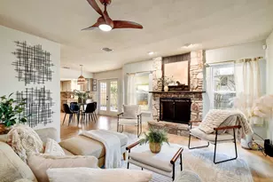 Nestled behind a majestic, time-honored tree, this charming traditional home is a private sanctuary, radiating warmth, elegance, and timeless character from the moment you arrive. A brick-paved walkway, thoughtfully lined with manicured bushes, guides you through the front yard to the inviting entrance, setting the stage for the enchanting details that await inside. Step into the grand foyer with a soaring 15-foot ceiling and one-of-a-kind, hand-crafted light fixtures that welcome you with a sense of artistry and grace. Sunlight dances across the hard-surface floors, flowing seamlessly through four spacious bedrooms and two beautifully appointed bathrooms. The first-floor primary suite is a serene retreat, featuring a stunning mural wallpaper that enhances the room's elegance, a renovated bath with a glass-enclosed rain shower, elegant stone accents, and a generous walk-in closet designed for both style and practicality. The heart of the home is the living spaces, which invite connection and celebration. The living room invites you in with a classic brick fireplace, while French doors open to the backyard, drawing the outdoors in. The dining room is adorned with exquisite mural wallpaper, creating an elegant backdrop for memorable meals and gatherings. The kitchen blends function and charm, with stainless steel appliances, abundant cabinetry, and an adjacent dining area perfect for family dinners and entertaining. Step outside to the extended covered back patio, overlooking a spacious backyard that features a cowboy pool and a brand-new shed, offering both storage and versatility. This private oasis is ideal for quiet coffee mornings or lively summer evenings with friends and family. Conveniently located near major retailers, including H-E-B, as well as a variety of popular restaurants, cafes, and shopping destinations! With every detail thoughtfully curated, it's a storybook setting waiting to be filled with your life's next chapter.