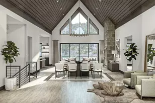This stunning modern farmhouse showcases a seamless blend of contemporary design and rustic charm. The exterior features a striking A-frame gabled roofline with steeply pitched planes, clad in dark shingles, complemented by a stone veneer base that anchors the structure to its natural surroundings. Expansive floor-to-ceiling glazing, including a dramatic triangular clerestory window, floods the interior with natural light while offering panoramic views of the adjacent landscape. The symmetrical facade is punctuated by deep-set windows and a prominent central entry, framed by a covered portico and accented with a minimalist fire pit. Inside, the open-plan layout boasts a vaulted ceiling with exposed timber beams, creating a grand sense of volume and warmth. The great room integrates a sophisticated dining area with a custom chandelier and a sleek kitchen featuring a large central island with a marble countertop, flanked by dark cabinetry and integrated appliances. Floor-to-ceiling windows enhance the connection to the outdoors, while polished hardwood flooring and a stone accent wall add texture and depth. The space is elevated by natural minimalist finishes, including raw wood accents, smooth plaster walls, and unadorned stone elements, fostering a serene and uncluttered aesthetic that harmonizes with the home's natural setting. Located in a serene setting with community water access, this property offers a unique retreat for recreation lovers. Featuring a community boat ramp and a marina with leased slips, this blank slate lot is perfect for building your dream home and enjoying aquatic adventures like boating or fishing. The property provides high-speed fiber optic service, a 24/7 staffed guard gate, and access to seven man-made lakes and community parks. Membership with the Omni Barton Creek Country Club at Lakeside or Omni Barton Creek Country