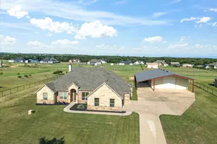 HOLY SHOP, you will be in the envy of all your friends and family! 40x80 workshop with a 58x98 under-roof area. Outfitted with 220-volt electric service and a car lift, this shop provides room to comfortably accommodate up to 15 vehicles. You also have 2 ACRES fully fenced! This thoughtfully designed one-story residence offers both functionality and comfort, tailored for versatile living arrangements. With four spacious bedrooms and three full bathrooms, including a dedicated home office and a multi-purpose room, this layout caters well to growing families or multi-generational households. The open concept living areas highlight elegant wood accents that bring warmth and character. A generously sized kitchen features double ovens and ample counter space, ideal for preparing meals for gatherings of any size. Each bedroom is complemented by built-in closet systems, enhancing organization and storage capabilities throughout the home. The primary bedroom provides a tranquil retreat with its private en-suite bath, while the additional bedrooms and bathrooms ensure comfort and privacy for all occupants. A three-car attached garage adds convenience and extra room for storage or hobbies. Additional modern upgrades include a whole-home water softener system with kitchen sink filter and pre-wiring for exterior lighting. Located nearly equal distance between two charming Texas towns, Springtown and Weatherford, this property offers a peaceful setting with easy access to local amenities and services. Whether you're managing a bustling household or seeking space and flexibility, this property delivers the features to support your lifestyle.
