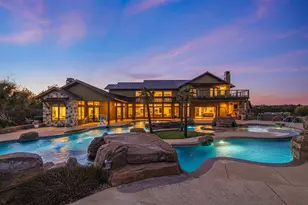 Paradise on the Hill with miles of panoramic views overlooking the Hill Country and just 1 mile from downtown Wimberley. Sitting on just over 22 acres just outside the city limits allowing it be used as multiple uses(Vineyard, Retreat, Short Term Rental, Wedding Venue) this Hill Country Modern design offers a beautiful Hill Country paradise. Secluded country-living with all of the modern amenities we expect in luxury that include a library, hobby room, a media/gaming room, movie theater, custom cabinets with multiple functions throughout and a multi temperature controlled wine refrigerator. Generous outdoor spaces include multiple patios, a second floor deck, over 1200 sqft of covered patio space that has full drop down automated screens, large masonry gas fireplace, and a resort-like pool complete with lazy river and lagoon, and a slide that cascades through waterfalls. Large windows encompass the home with natural light. The primary bedroom offers a luxurious bath and a California Closet. 5 additional bedrooms & 5 full baths for each room upstairs. Attached 3 car garage on the main house, and a detached fun zone/garage with endless possibilities of what you want to create. Current owner used this as a game room with pool table, ping pong, shuffleboard, foosball, and many other activities for kids. Previously a 7 car showroom which is still wired for 2 - 6,500 lb. capacity car lifts. This structure also includes a home office space, fully equipped gym, and a massive walk-in wine cooler that can hold up to 1000 bottles of your favorite vintage wines. The property features a state of the art built-in BBQ with pellet smoker and gas grill and an RV Barn with septic connections currently converted to a sport court with pickleball, basketball, and volleyball court. 2 acre fully fenced raised bed garden with chicken coop and 30 tree orchard, on separate well and water storage tank. Location is ideal with Blue Hole Park, and downtown just minutes away.150kw home generator.