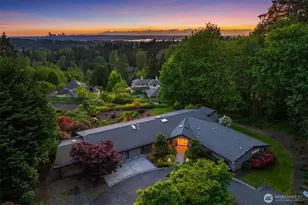 A rare opportunity, this sunlit rambler offers prime western exposure with unobstructed views of the city skyline, snowcapped Olympic Mts & spectacular sunsets. Convenient one-level living with great room that opens to the expansive patio & features vaulted ceilings, media wall & slab granite kitchen. Formal areas with walls of windows capture panoramic views & open to the backyard. Generous primary suite with gas fireplace, updated bath & large walk-in closet. Den with French doors. Perfectly sited on 1.2 acres with direct access to Bridle Trails Park, the private setting boasts an inviting circular drive, level lawn & large garden space. A special highlight is the detached studio with kitchen, bath, laundry & exclusive patio access.