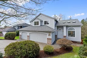 Bright & spacious 5 bedroom home, on quiet cul-de-sac, with fully finished living quarters in the daylight basement! Beautiful views of golf course, mountains, sound, & greenbelt w/ large backyard, fully fenced, perfect for pets & play. This home is great for entertaining! Enjoy vaulted ceilings, tons of natural light, skylights, plenty of storage, cozy gas fireplace, & deck with summer sun. Primary bedroom features 5 piece bath & huge walk-in closet. Daylight basement includes kitchen, 2 bedrooms, full bath, laundry, storage, & living/dining area w/ access to main level or can be separate entry. Brand new deck posts/beam, new carpet, 3 car garage w/ shop, 50 year GAF roof installed 2014, & all appliances stay. No HOA & close to schools!