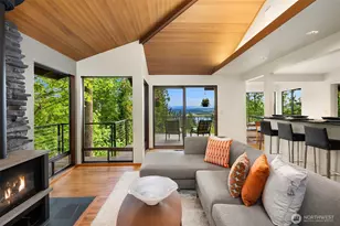 Nestled down a peaceful street, this spacious NW gem offers a secluded treehouse feel with breathtaking views. Gather or relax in multiple living spaces spanned by walls of windows framing the lake and mountains. Cooks will love the open eat-in kitchen. Step out for year-round enjoyment on the covered, heated deck, or escape to your vaulted primary suite with spa-like bath, dream walk-in closet, and office/nursery/flex room with view deck. Three more bedrooms (one with a built-in study area) + a huge rec room provide space for everyone. Enjoy the friendly neighborhood vibe with events like Friday Night Street Dinners and a WhatsApp group. Minutes from the island's top amenities and a short stroll to schools, the library, and Ellis Pond!
