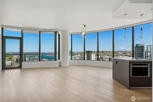 Experience luxury living at The Spire, perfectly situated at the intersection of Belltown, South Lake Union & Denny Triangle. Enjoy unparalleled views of the iconic Space Needle & the water from this unique condo building. This super spacious 2 bed/2 bth corner unit on the 26th floor has generous rounded corner living spaces with a wall of windows offering fabulous views of South Lake Union & the Needle. Contemporary kitchen features large island, Bosch appliances, deck & dedicated parking. Amenities include 24hr concierge, top-floor fitness center, pet run, 40th-floor clubroom, dining areas, terraces, co-working spaces, conference room, theater, yoga studio. Easy access to all things work & play downtown. Ask about buyer credit offered!